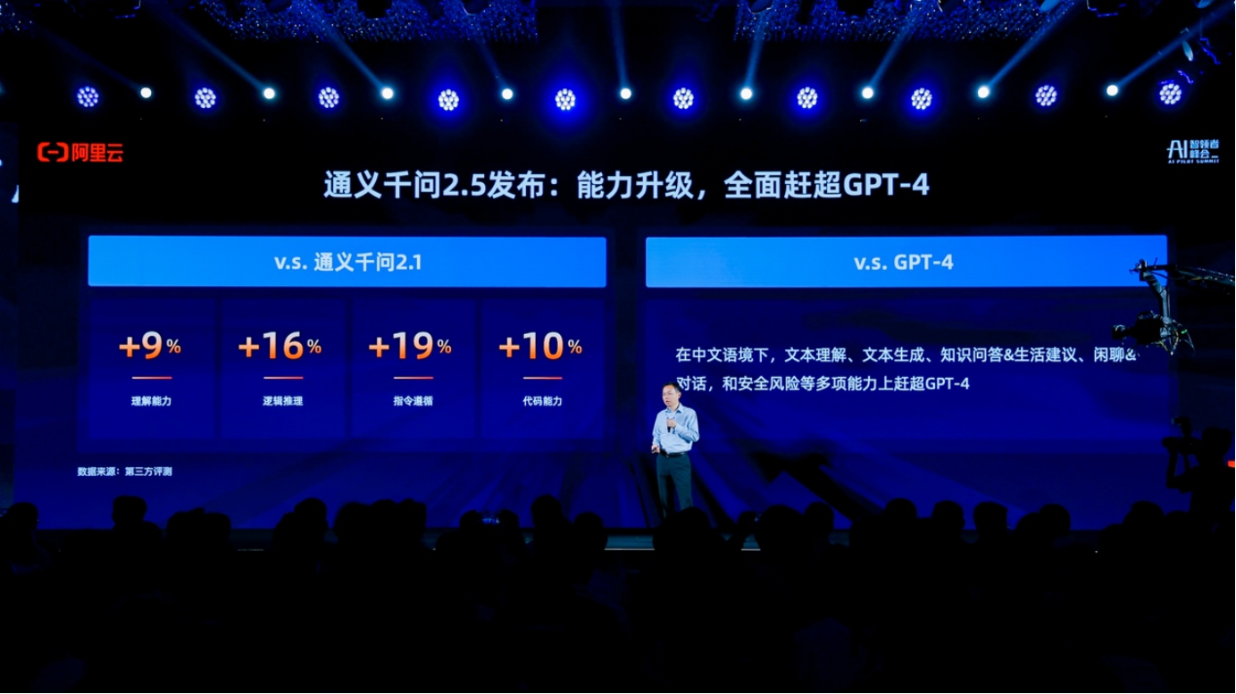 速途网5月9日消息(报道:李楠)今日,阿里云正式发布通义千问2.5,模型性能全面赶超GPT-4 Turbo,成为地表最强中文大模型。同时,通义千问最新开源的1100亿参数模型在多个基准测评收获最佳成绩,超越Meta的Llama-3-70B,成为开源领域最强大模型。