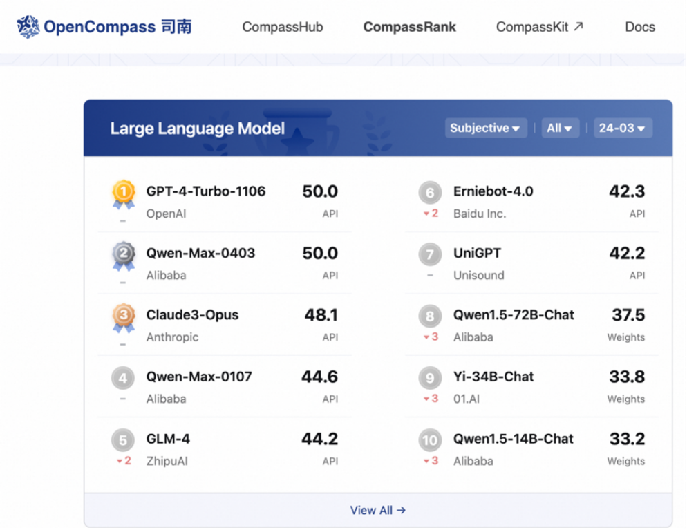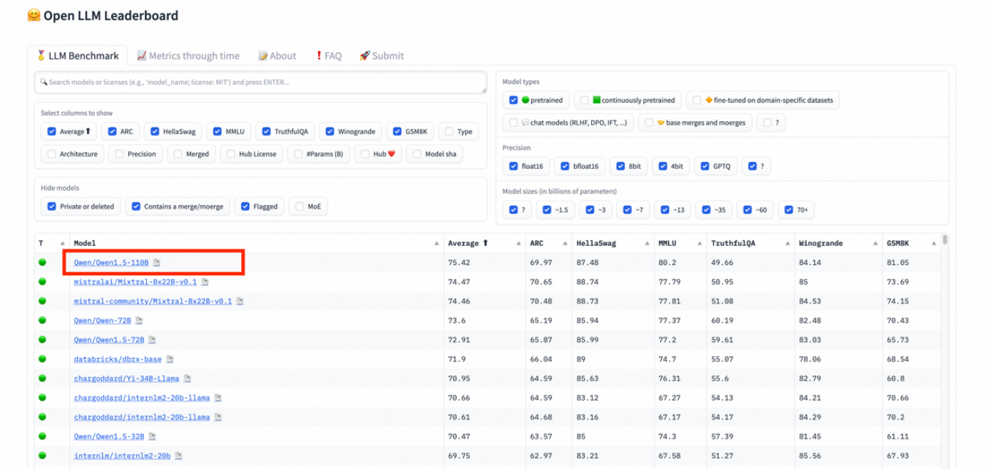 通义还发布了最新款开源模型,1100亿参数的Qwen1.5-110B,该模型在MMLU、TheoremQA、GPQA等基准测评中超越了Meta的Llama-3-70B模型;在HuggingFace推出的开源大模型排行榜Open LLM Leaderboard上,Qwen1.5-110B冲上榜首,再度证明通义开源系列业界最强的竞争力。