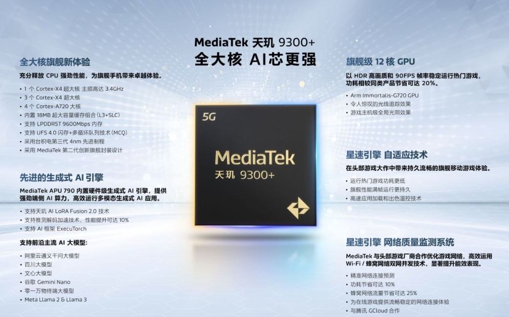 此次发布的升级版天玑9300+也沿用了全大核CPU架构,八核CPU包含4个 Cortex-X4 超大核,最高频率可达3.4 GHz,以及4个主频为2.0GHz的Cortex-A720大核。此外,天玑9300+能够在端侧支持AI推测解码加速技术,同时支持天玑AI LoRA Fusion 2.0技术,提供更高效和个性化的生成式AI体验。