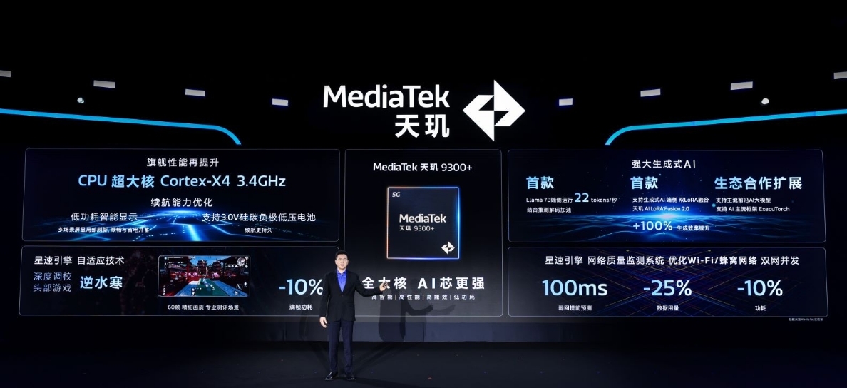 据了解,天玑9300+支持前沿主流的生成式AI大模型,还支持AI框架ExecuTorch,可加速端侧生成式AI应用的开发进程。目前,该芯片将在vivo X100s、iQOO Pad2 Pro 平板等设备上搭载。