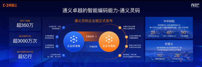 阿里云和中华财险等企业成为首批通义灵码企业版客户。阿里云是国内首家推行全员AI编码的云厂商,内部已全面切换通义灵码企业专属版,目前26%的新增业务代码由通义灵码编写,研发效率提升10%。中华财险正在探索大模型在保险行业的应用,60%技术人员已开始使用通义灵码,1/4的编码任务由通义灵码完成,基于通义灵码的研发问答准确率达90%。此外,通义灵码编码助手还“入职”了多家金融、汽车、新零售、互联网等企业。