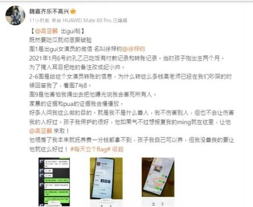 1. 高亚麟出轨小自己26岁的女演员徐梓钧,并将其微信名改为“纪小帅”,多次向其大额转账;