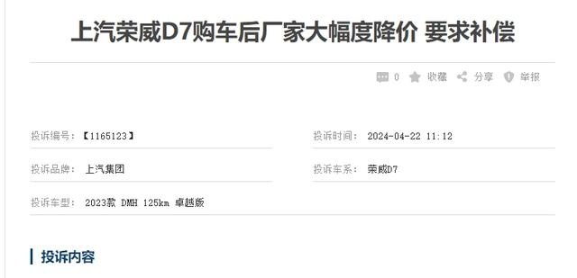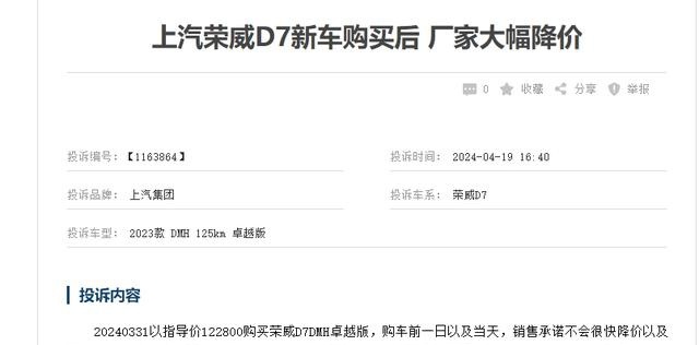 而官方降价则引发了老车主的不满,认为是被背刺,有网友在车质网投诉称:“20240331以指导价122800购买车荣威D7DMH卓越版,购车前一日以及当天质,销售承诺不会很快降价以及就算降价也会给网予补差价承诺,20240411荣威官方降价,该款车型指导价降为115800,十天时间损失7000,要求给予补偿。”