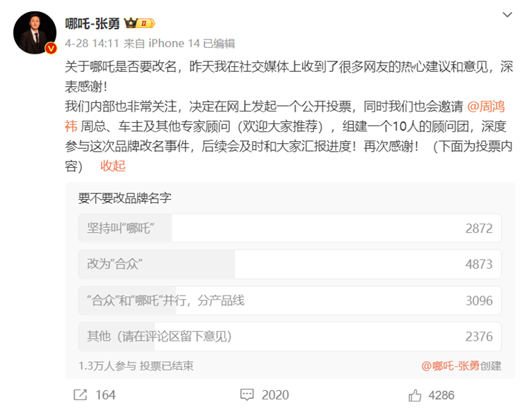 前不久周鸿祎犀利批评哪吒汽车的命名,随后哪吒汽车CEO张勇便表示认真考虑哪吒汽车是否要改名,并且还发布了投票,让网友参与其中。根据目前社交平台显示的投票结果来看,哪吒汽车改名为合众的支持者最多,但是仍然不到一半。不过张勇曾发布视频表示哪吒这个品牌是他本人取的,因此很有感情,不想换名字。