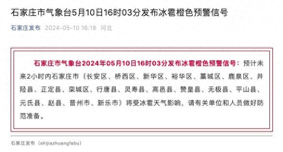 石家庄市气象台2024年05月10日16时03分发布冰雹橙色预警信号:预计未来2小时内石家庄市(长安区、桥西区、新华区、裕华区、藁城区、鹿泉区、井陉县、正定县、栾城区、行唐县、灵寿县、高邑县、赞皇县、无极县、平山县、元氏县、赵县、晋州市、新乐市)将受冰雹天气影响,请有关单位和人员做好防范准备。