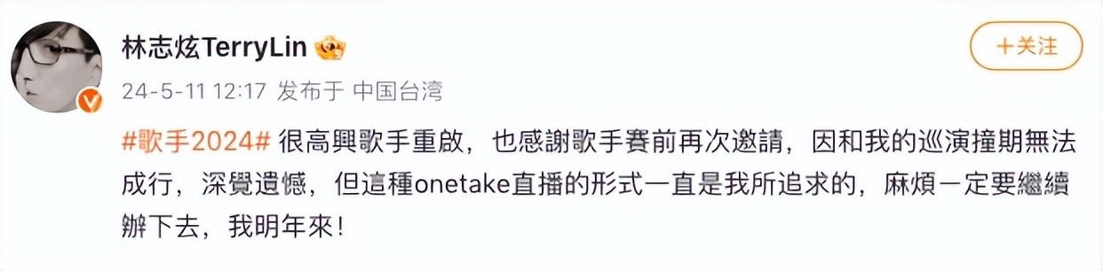 林志炫表示:“很高兴歌手重启,也感谢歌手赛前再次邀请,因和我的巡演撞期无法成行,深觉遗憾,但这种one take(一次完成)直播的形式一直是我所追求的,麻烦ㄧ定要继续办下去,我明年来! ”