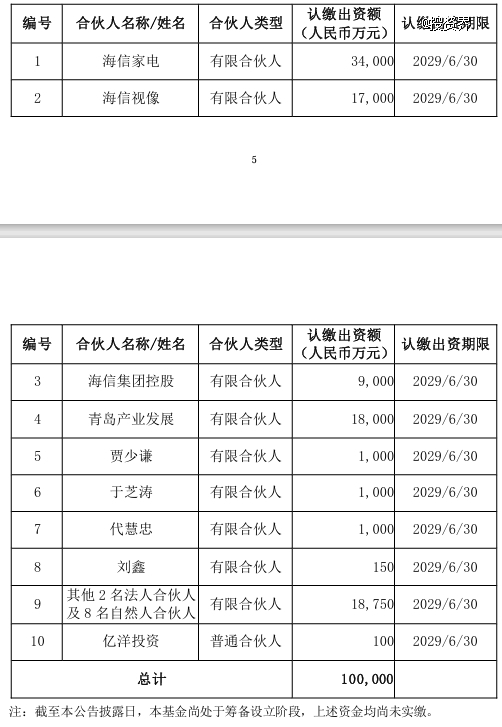 投资界-解码LP获悉,近日,海信家电(SZ.000921)发布公告,公司拟作为有限合伙人与海信视像、海信集团控股、青岛产业发展、亿洋投资等共计7名法人合伙人,及代慧忠等共计12名自然人合伙人签订合伙协议,共同出资发起设立青岛奥宸私募股权投资基金合伙企业(有限合伙)(暂定名),海信集团CVC产业投资机构亿洋投资作为基金管理人,基金规模10亿元。