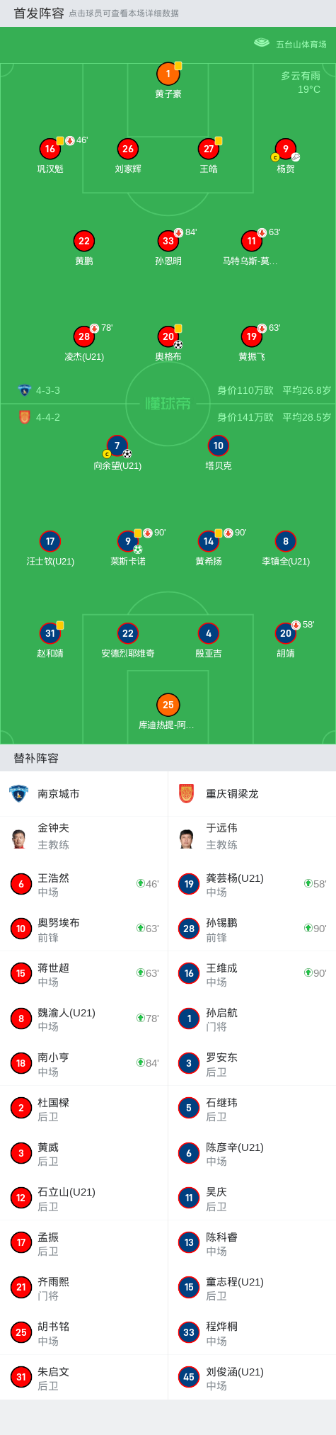 第28分钟,杨贺开出任意球,奥格布将球撞进球门,南京1-0重庆