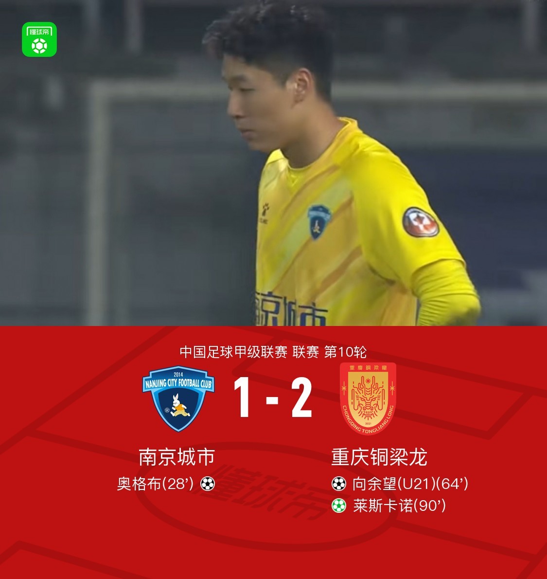 北京时间5月11日中国足球甲级联赛 联赛 第10轮,南京城市主场对阵重庆铜梁龙。上半场杨贺开出任意球,奥格布将球撞进球门。下半场黄子豪超级低级失误,向余望头球破门扳平比分,比赛尾声塔贝克禁区内倒地,裁判判点,莱斯卡诺点射反超比分。最终重庆铜梁龙2-1逆转南京城市。