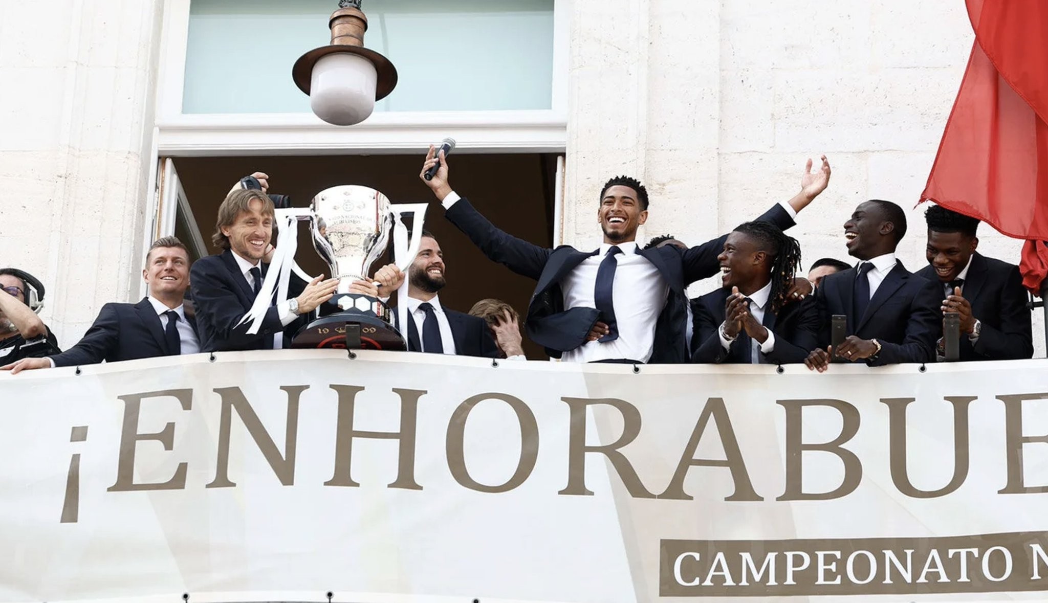 当地时间本周日,皇马在西贝莱斯广场进行了西甲夺冠的庆祝活动,球员们现在走上了索尔社区总部的阳台上,向球迷们展示冠军,并且纷纷呐喊为球队加油。