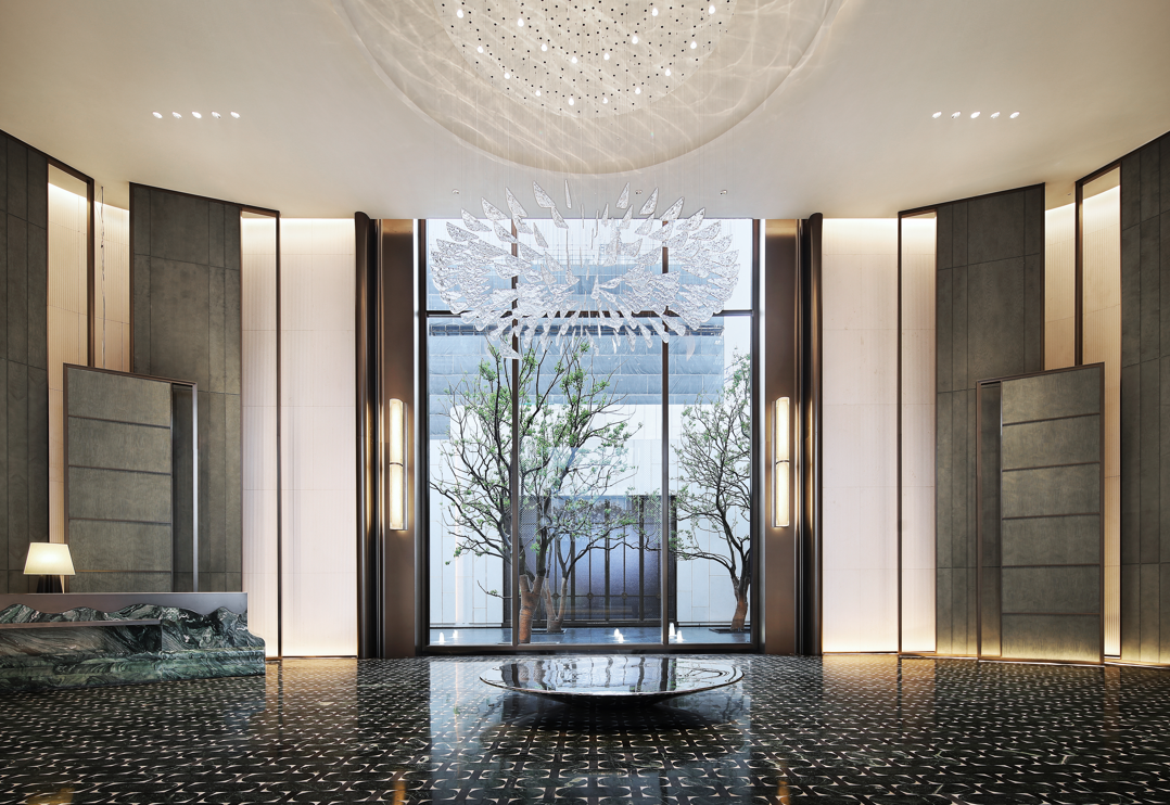 这次保利·海晏天珺采用的是“回廊式度假酒店”设计,酒店式入户大堂取代了传统的社区大门,采用5米高的铜门,两侧雕刻玫瑰金玉石,从心理上与外界形成空间上的分割。