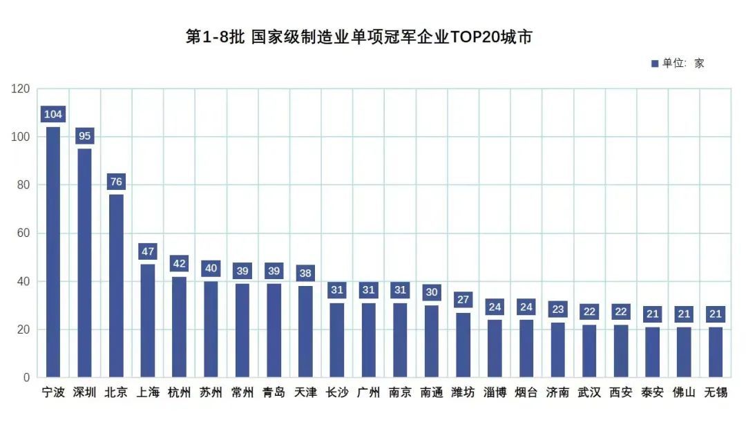 据工信部数据统计,五批国家级专精特新“小巨人”企业,宁波高达352家,位居全国第五,仅次于北上深苏。而在最新公布的八批国家制造业单项冠军榜上,宁波共有104家企业入选,超越深圳,牢牢霸居中国第一城。