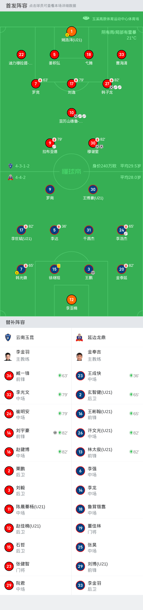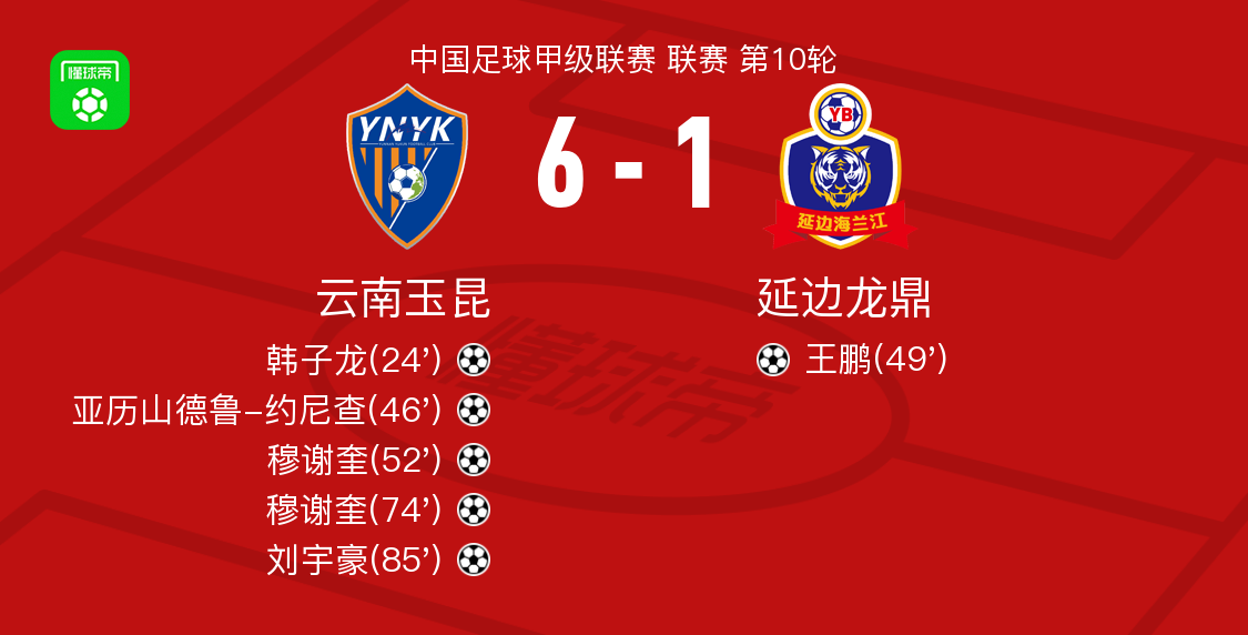 北京时间5月12日中国足球甲级联赛 联赛 第10轮,云南玉昆主场对阵延边龙鼎。云南玉昆韩子龙破门,亚历山德鲁-约尼查破门,穆谢奎梅开二度,刘宇豪破门。延边龙鼎王鹏破门。最终比分云南玉昆 6-1 延边龙鼎。