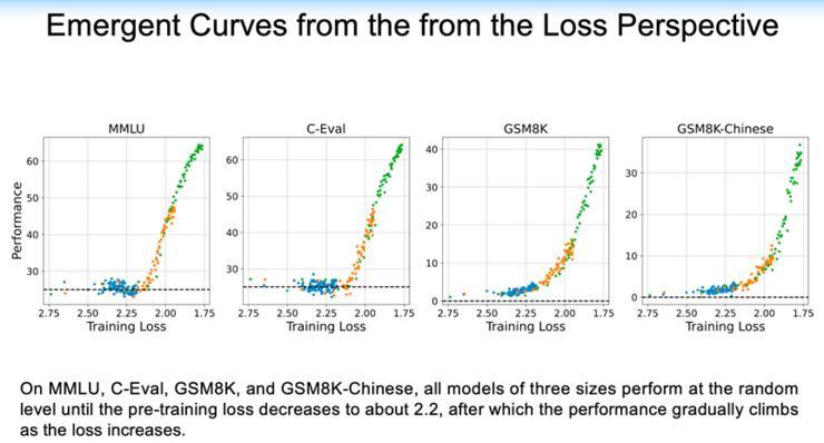 将训练损失标为 X 轴、模型性能标为 Y 轴后,研究人员发现,如果训练损失达到了 2.2 的阈值,模型性能就会攀升。由此可见,模型的 " 涌现能力 " 除了与模型大小、训练数据量紧密关联,也可能源自于训练损失。
