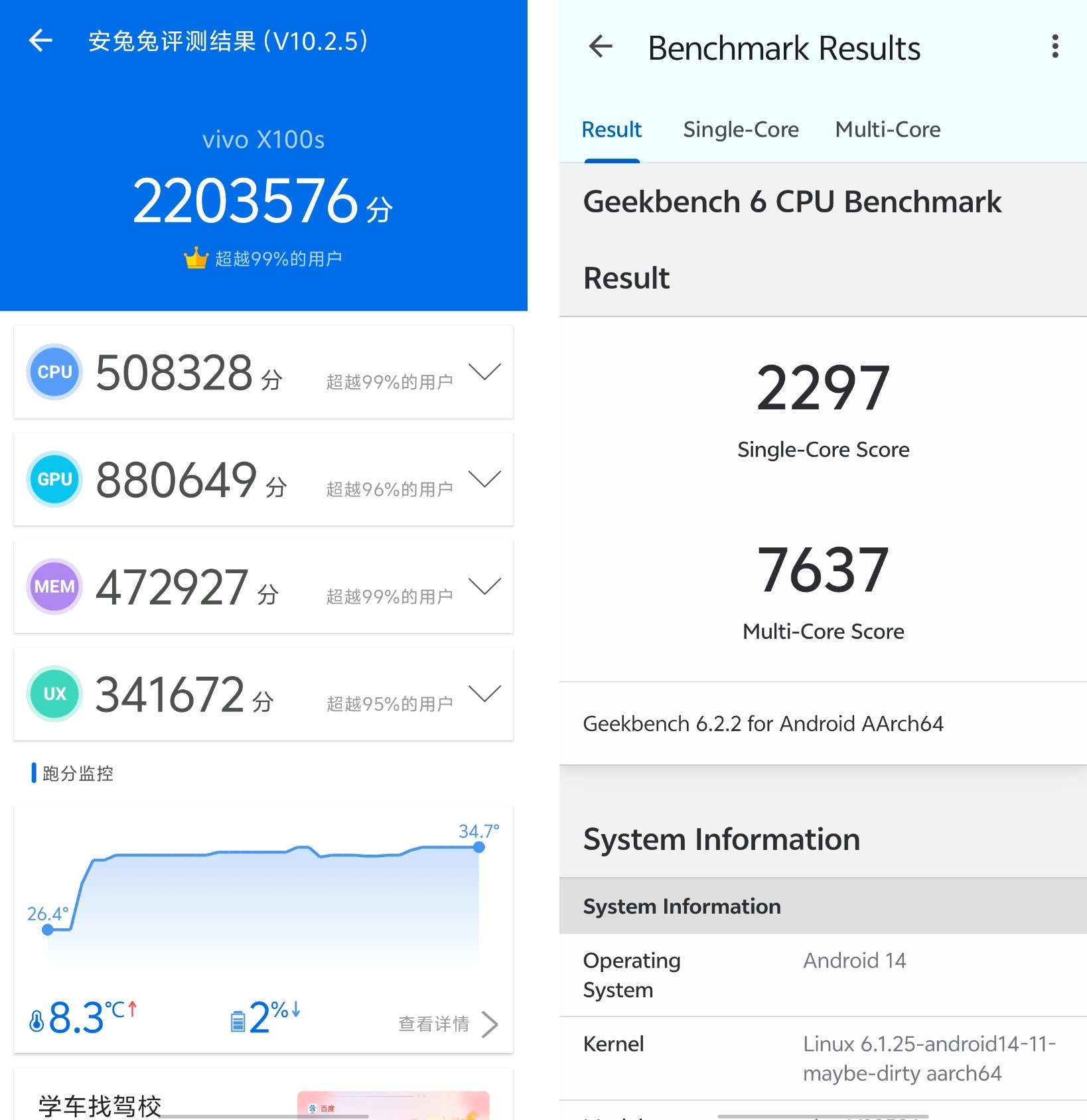 室温25度左右环境下,搭载天玑9300+的vivo X100s安兔兔V10跑分达到220万分,Geekbench V6单核为2297分,多核7637分,相较于天玑9300在分数小幅上升,但足以让其成为目前综合性能最强的手机端芯片,傲视群雄。