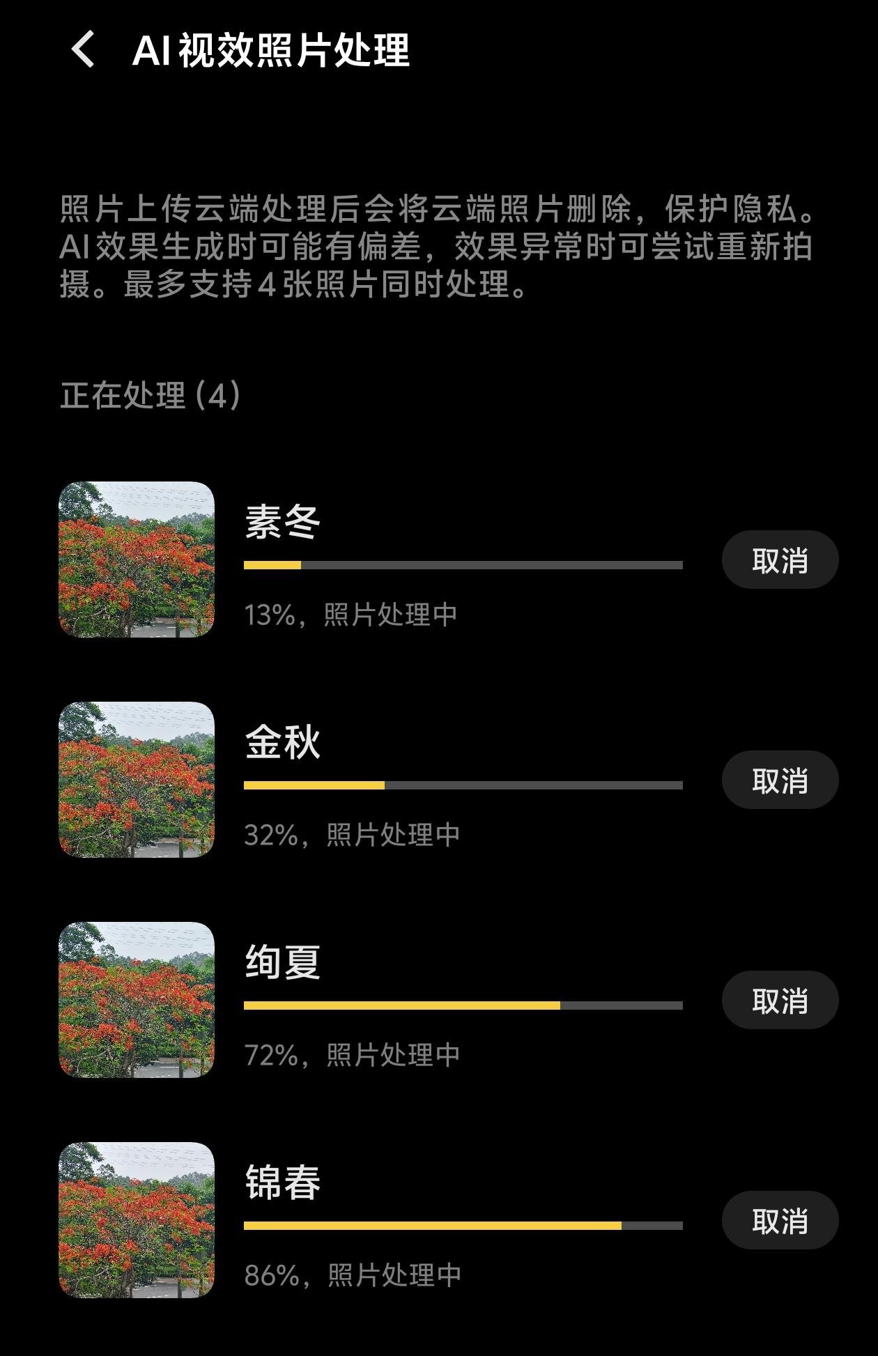 四季人像功能可以简单地理解为,使用AI实现人像的扣图,以及以四季为主题通过AIGC生成与原图背景类似的图片,再实现人物与背景的完美融合。其中的原理并不难,只是对手机AI算力的要求十分高,vivo称,每一张四季人像照片,背后都需要超过2000TFlops的底层算力支持,当我们按下快门键后,原图会上传到云端进行处理(最多同时4张照片),完成后再回传到本地手机,并将云端的照片删除处理。