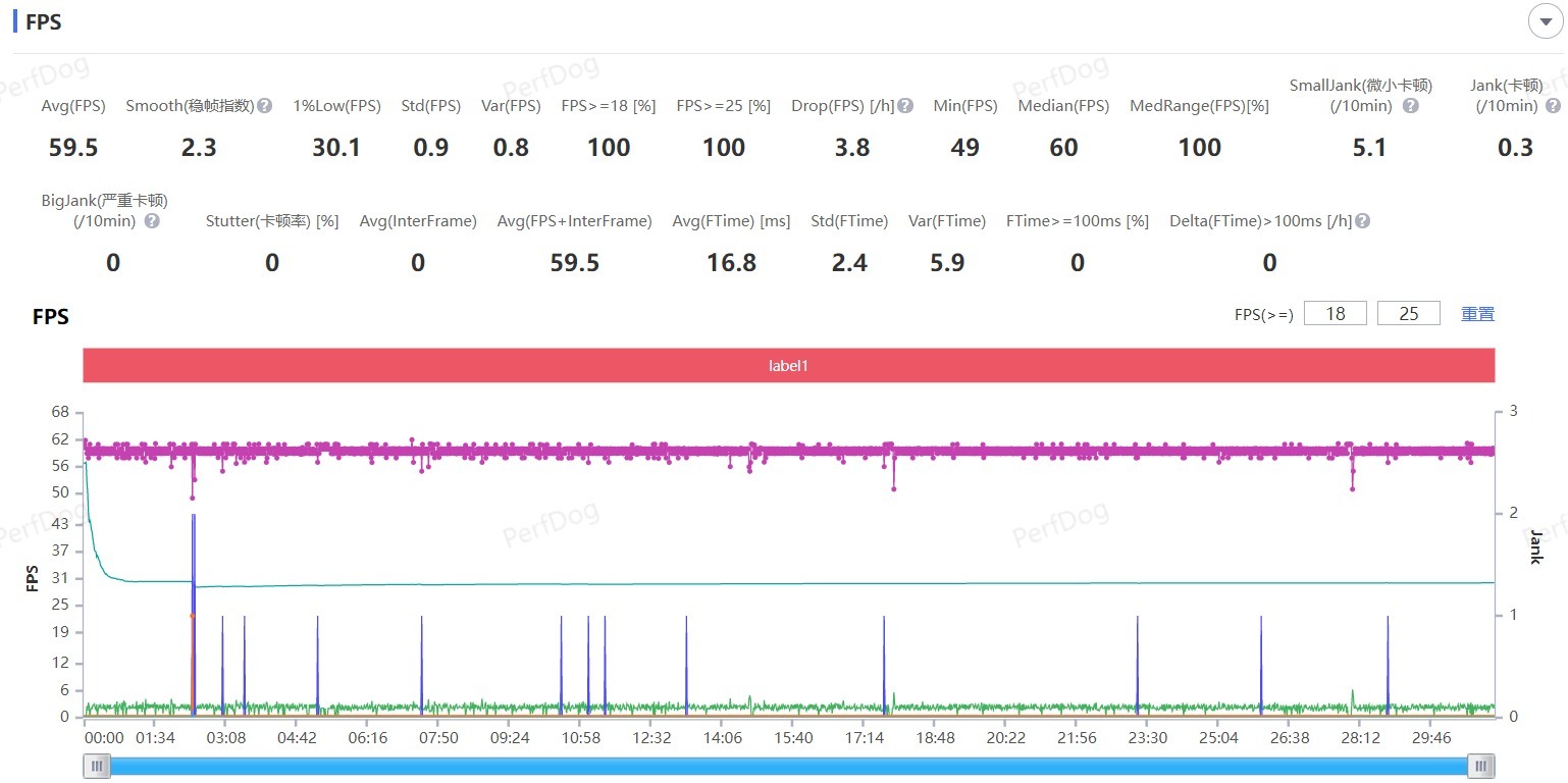 既然已经是旗舰了,我们的游戏环节就直接上30分钟高画质+60帧模式的《原神》须弥城跑图,测得平均帧率为59.5,除了中间传送时会有轻微掉帧外,其他时间基本稳如一条直线。