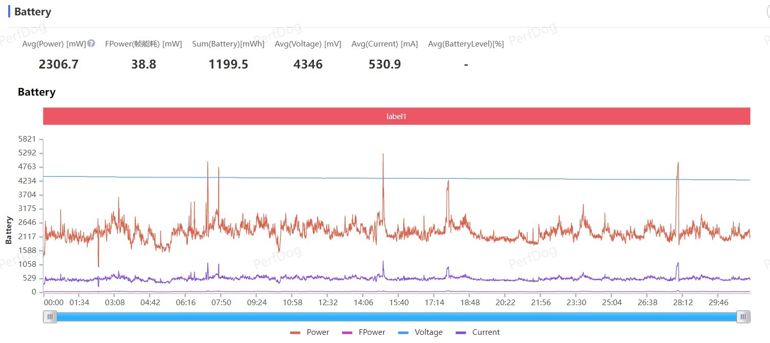 同样的半小时游戏场景下半小时《原神》功耗为4.6W(双电芯设计,单颗电芯功耗为2.3W),也是比较理想的水平,半个小时的《原神》后,机身只是轻微的升温,不影响游戏的操作体验。