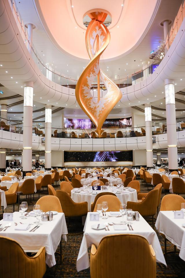 主餐厅位于船舱三、四层,可谓“富丽堂皇”。不仅大饱口福,更是船上一处“很出片”的打卡点。还值得一提的是,相比于以往邮轮上常出现的排队用餐问题,主餐厅优化采用自主预定时间,无需提前排队等候,带给游客更轻松的用餐体验。
