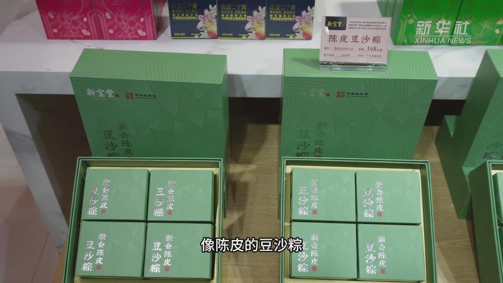 陈皮花生、陈皮饮料、陈皮膏方、陈皮粽子……传承非遗“新会陈皮制作技艺”,来自广东的“老字号”品牌新宝堂带来一系列新品。