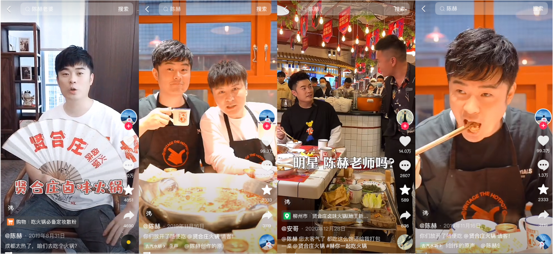 消费者更确切的感受,来自于短视频平台上,陈赫出现得越来越频繁,他带着各路明星、网红大V吃贤合庄的片段,哪哪都是。故事的展开,都极其相似:明星网红在贤合庄偶然碰见正在吃火锅的陈赫,顺势坐下“蹭吃蹭喝”,再抖几个包袱。陈赫的工作也很简单,有时甚至不用说台词,只要眯起眼睛、挑一挑眉,像《爱情公寓》主角曾小贤那样贱贱地笑一下就行。