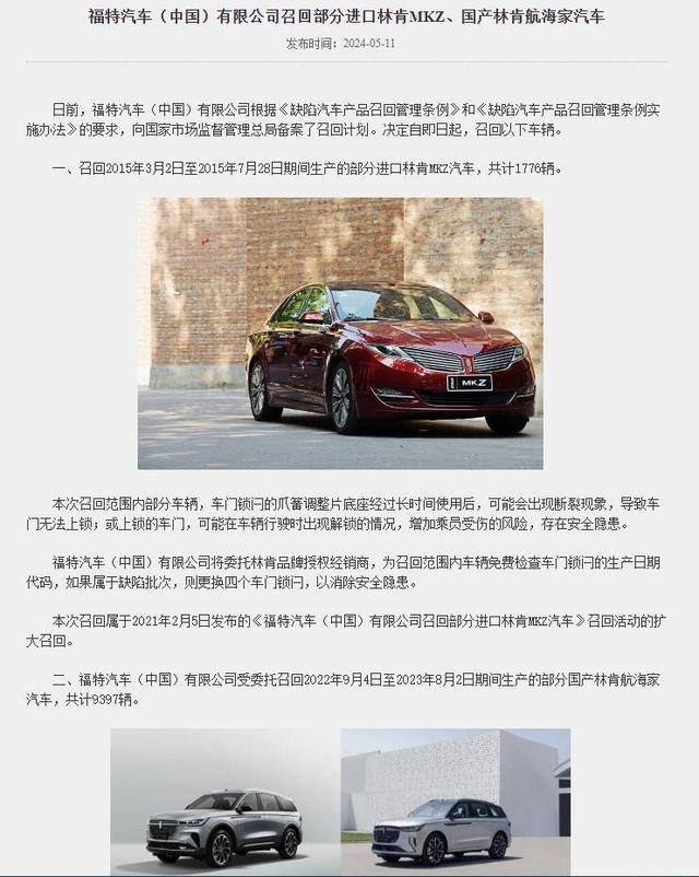 屋漏偏逢连夜雨的是,林肯在华本身销量就不高,如今却又陷入了召回风波,涉及车型超万辆。据悉,近日国家市场监督管理总局缺陷产品召回技术中心公布了福特汽车的召回计划,此次将召回2015年3月2日至2015年7月28日期间生产的部分进口林肯MKZ汽车,共计1776辆。以及2022年9月4日至2023年8月2日期间生产的部分国产林肯航海家汽车,共计9397辆。