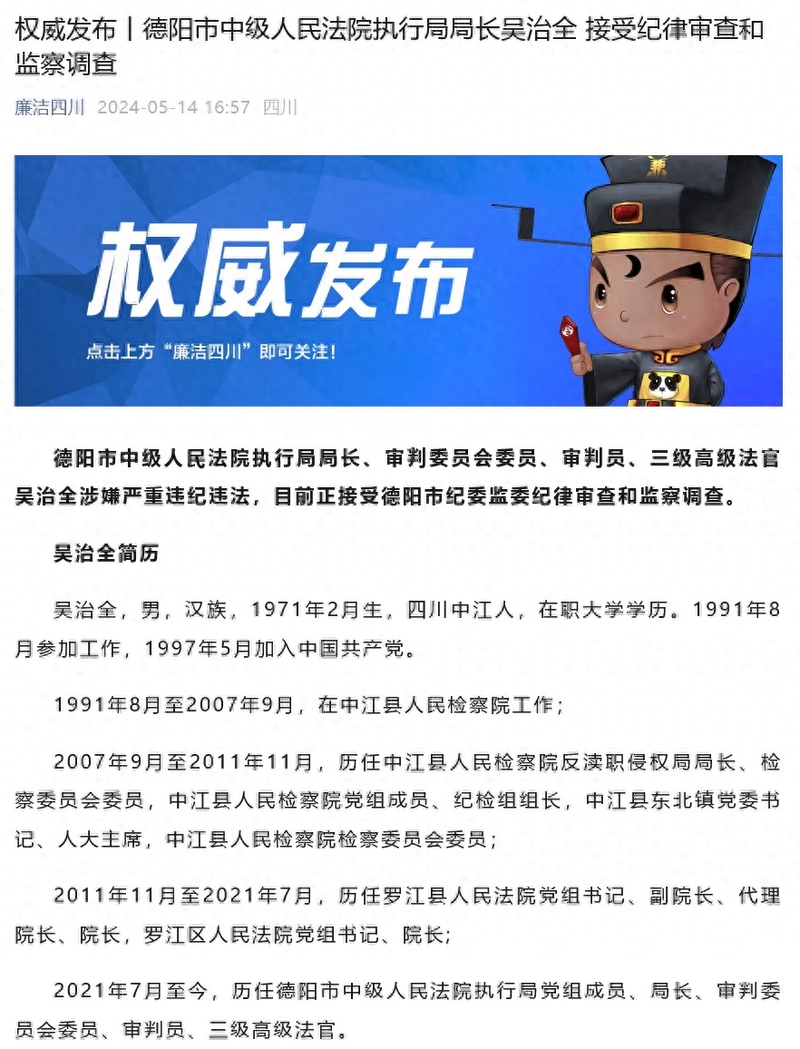 5月14日,据“廉洁四川”消息,德阳市中级人民法院执行局局长、审判委员会委员、审判员、三级高级法官吴治全涉嫌严重违纪违法,目前正接受德阳市纪委监委纪律审查和监察调查。