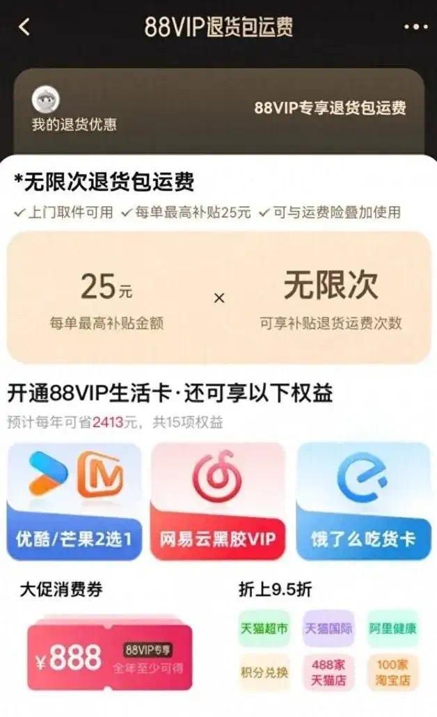 今年4月,淘宝88VIP会员权益进行了全面升级,最引人瞩目是推出了无限次退货包运费的权益。
