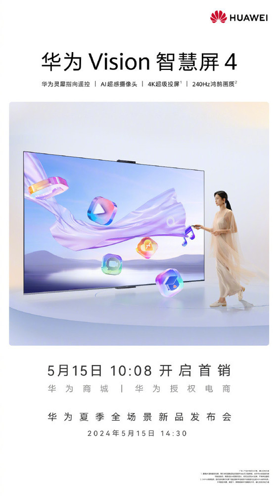 【CNMO科技消息】4月24日,华为Vision 4智慧屏发布并正式开启预售。CNMO注意到,这颗产品将于5月15日10:08开启首销,感兴趣的网友可以关注官方商城。