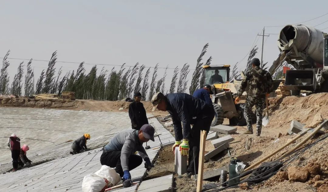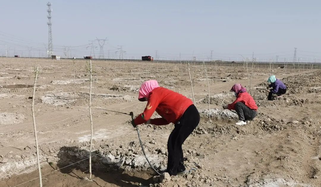 在瓜州县城东入口防护林工程现场,县林草中心积极落实维保管道、灌溉浇水、培土扶正等新植苗木抚育管护措施。