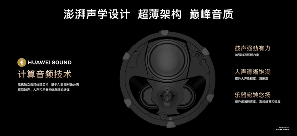 全新亮相的华为全屋智能超薄吸顶音箱,采用澎湃声学设计,让音质再次飞跃。8cm的超薄架构,较此前的吸顶音箱减少了近一半的厚度,纤薄的体积,能满足大部分户型吊装场景的安装。同时,华为全屋智能超薄吸顶音箱依托独立的专业音频处理芯片,搭载HUAWEI SOUND计算音频技术,可基于AI音频对象分离,提取人声、鼓声和乐器等对象信息进行渲染增强。通过加强鼓声低频力度,让鼓声强劲有力;提升人声柔和度、清晰度,使人声清晰饱满;提升乐器明亮度、高频细节和延展,令乐器宛转悠扬。