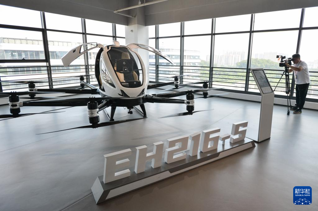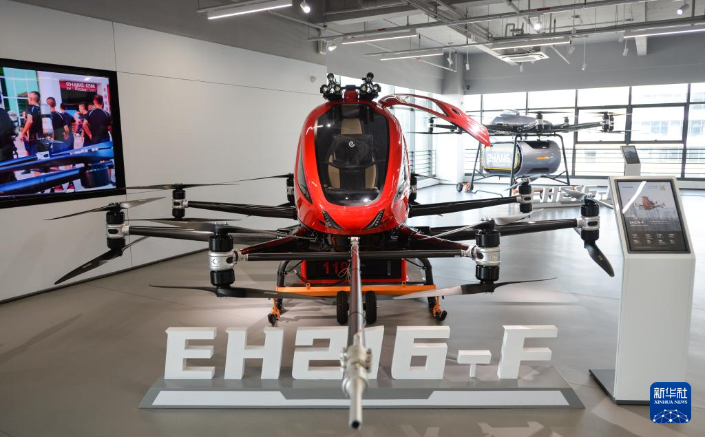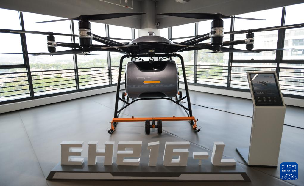 这是5月14日在亿航智能设备(广州)有限公司展厅拍摄的为中短途交通设计的EH216-S载人级无人驾驶飞行器。