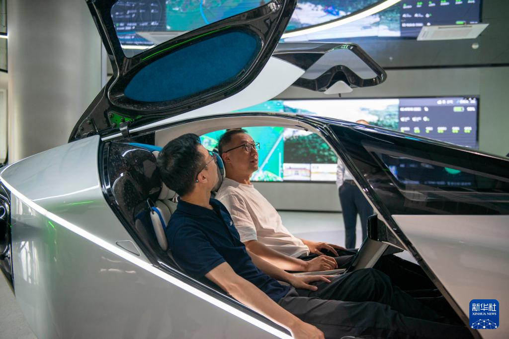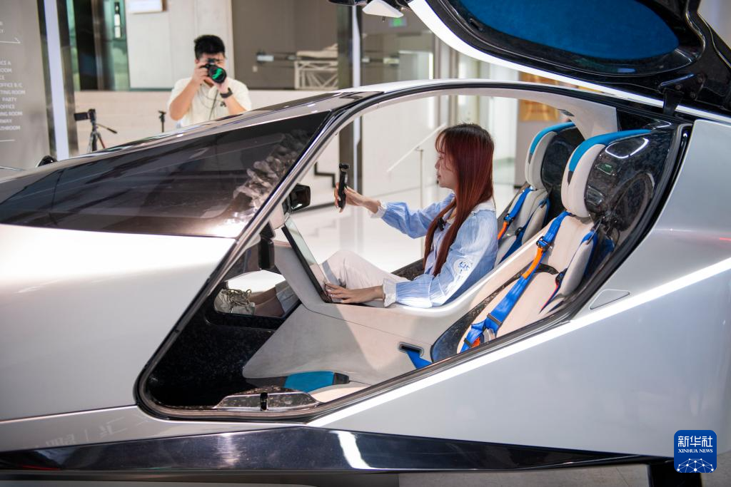 5月15日,在广州市番禺区小鹏汇天总部,记者在飞行汽车旅航者X2上体验拍摄。