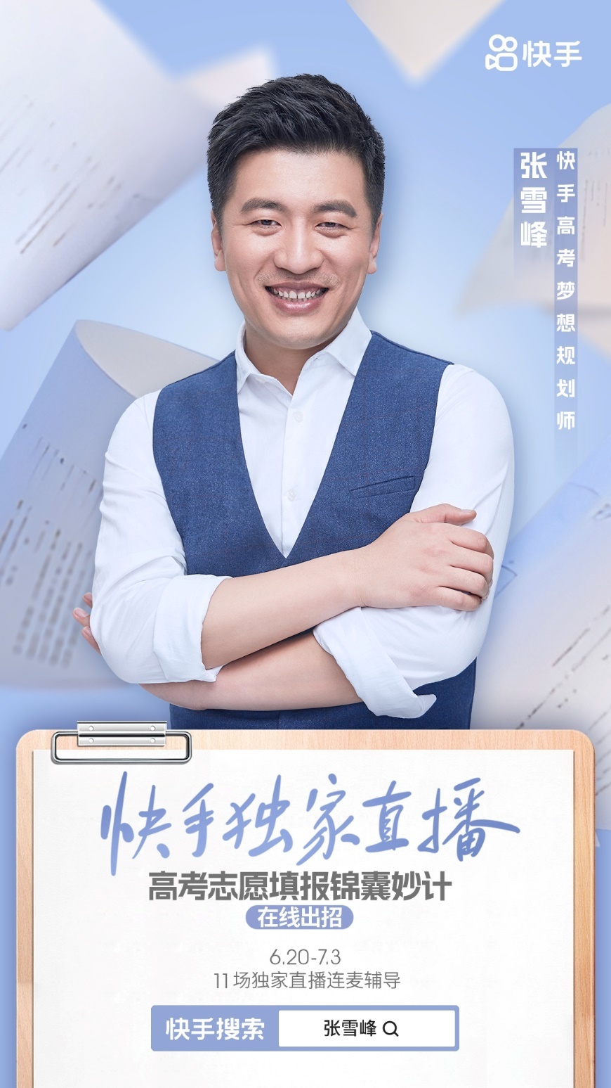 5月15日,知名教育创作者@张雪峰老师发布视频称将在快手开启11场独家直播,时间为6月20日至7月3日,每晚19:30开始。他透露,直播内容为高考志愿填报干货分享,连麦辅导部分快手用户。