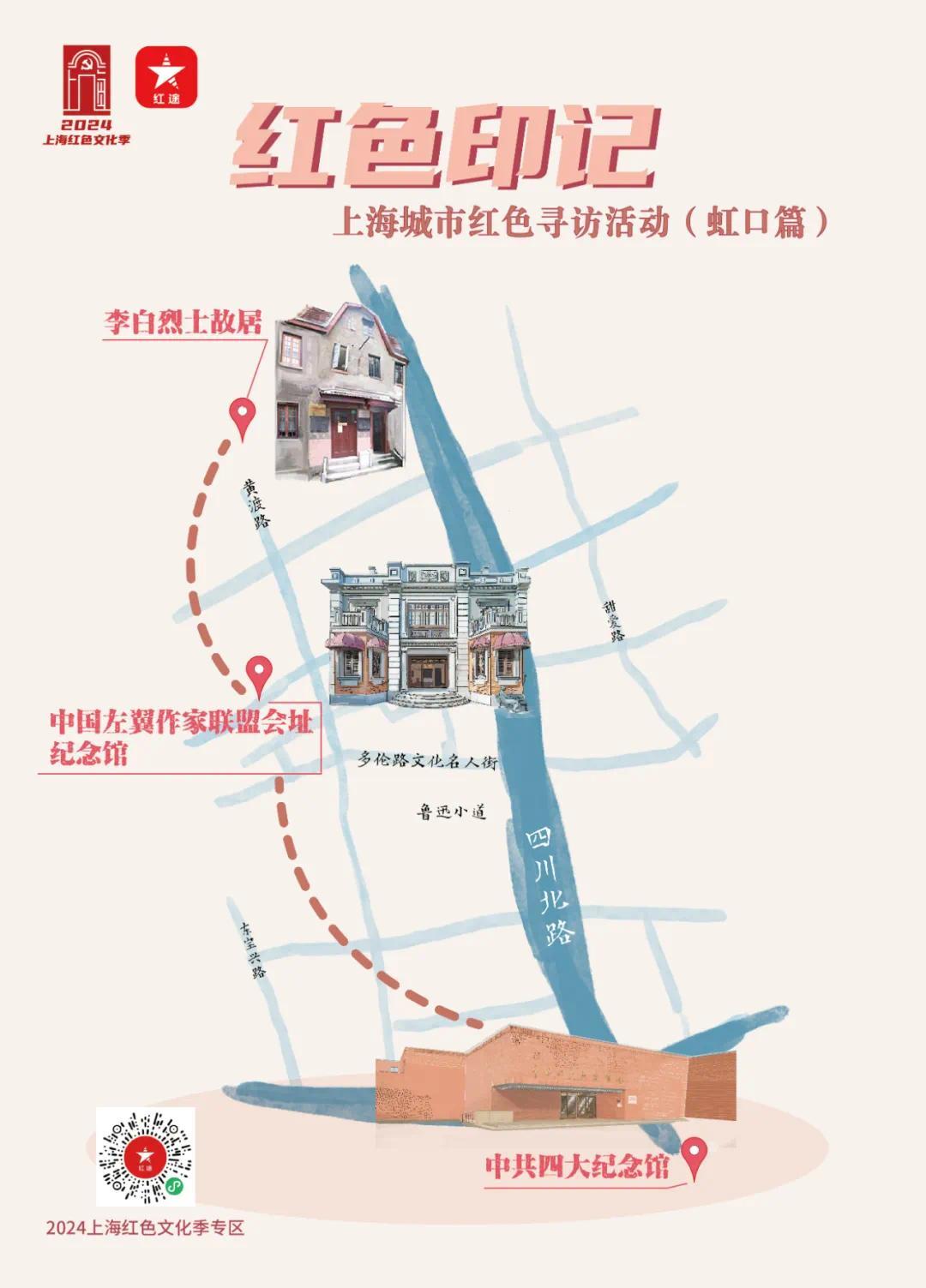 本次寻访活动聚焦虹口四川北路区域,覆盖“初心之地”“文化红浪”“日月新天”三大寻访主题。路线串联中共四大纪念馆、中国左翼作家联盟会址纪念馆、李白烈士故居三个主题场馆,带领参与者探寻“虹”色记忆。