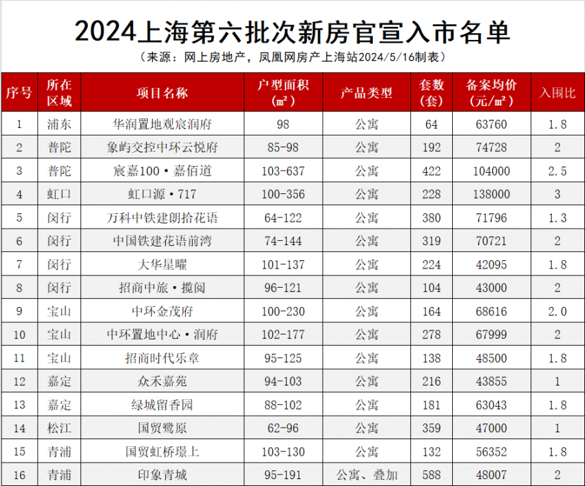 凤凰网房产上海讯 5月16日,上海第六批次新房名单公示。本次上市16个商品住房项目,共45.2万平方米,合计3989套房源。分布在浦东、普陀、虹口、闵行、宝山、嘉定、松江、青浦8个区域,楼盘认购和开盘日期另行公布。