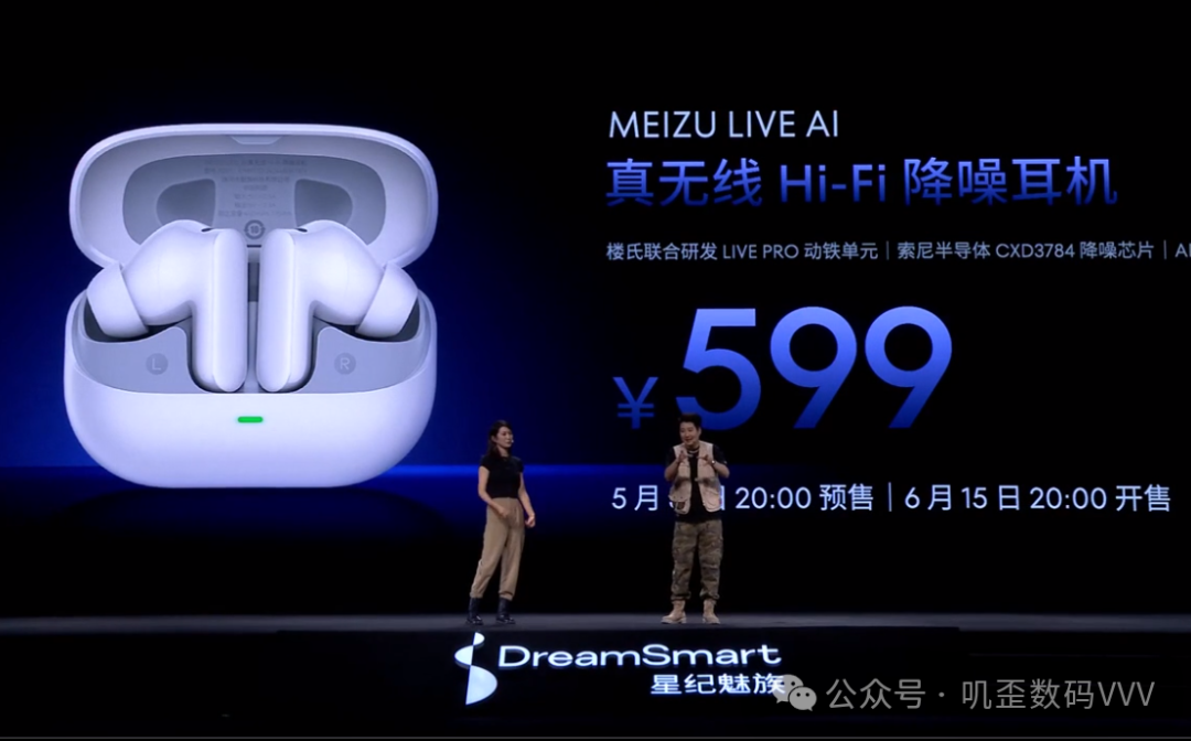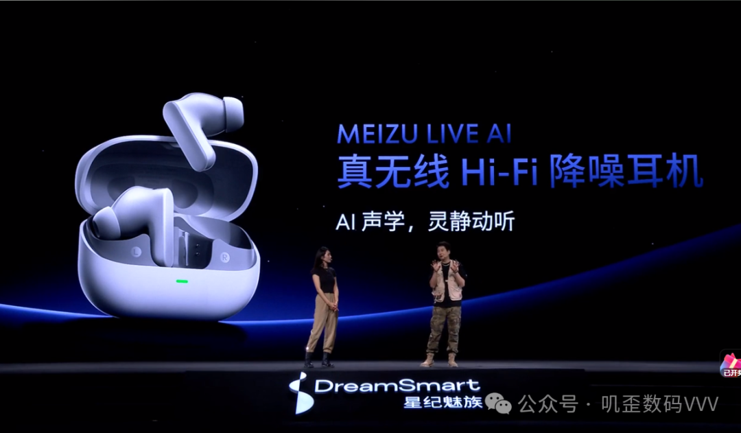 另一款硬件新品是魅族 LIVE AI 真无线Hi-Fi降噪耳机,内置了楼氏LIVE PRO动铁单元,采用了同轴圈铁双单元发声架构,使用了索尼半导体解决方案公司的 CXD3784 降噪芯片。搭载了自研AI灵动听感,支持AI 智能降噪、AI通话降噪,结合瑞典 Audiodo 研发的 Personal Sound 技术,可以根据个人听觉去调整音乐频率。价格是599元。