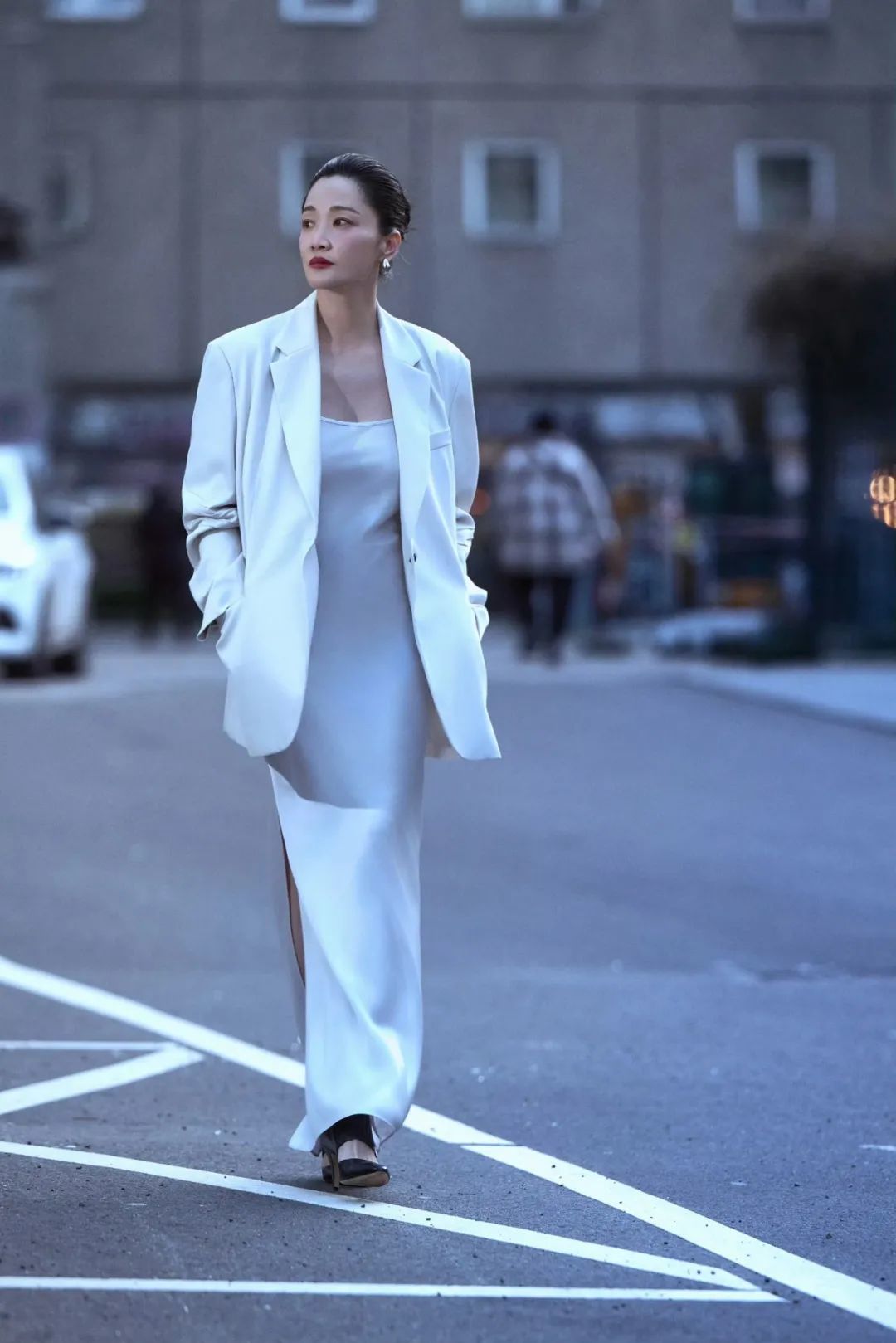 一袭流光吊带裙,与白色廓形西装相得益彰。利落的盘发辅以松弛的状态,在星光熠熠的红毯上,她呈现出一种遗世独立的韵致。
