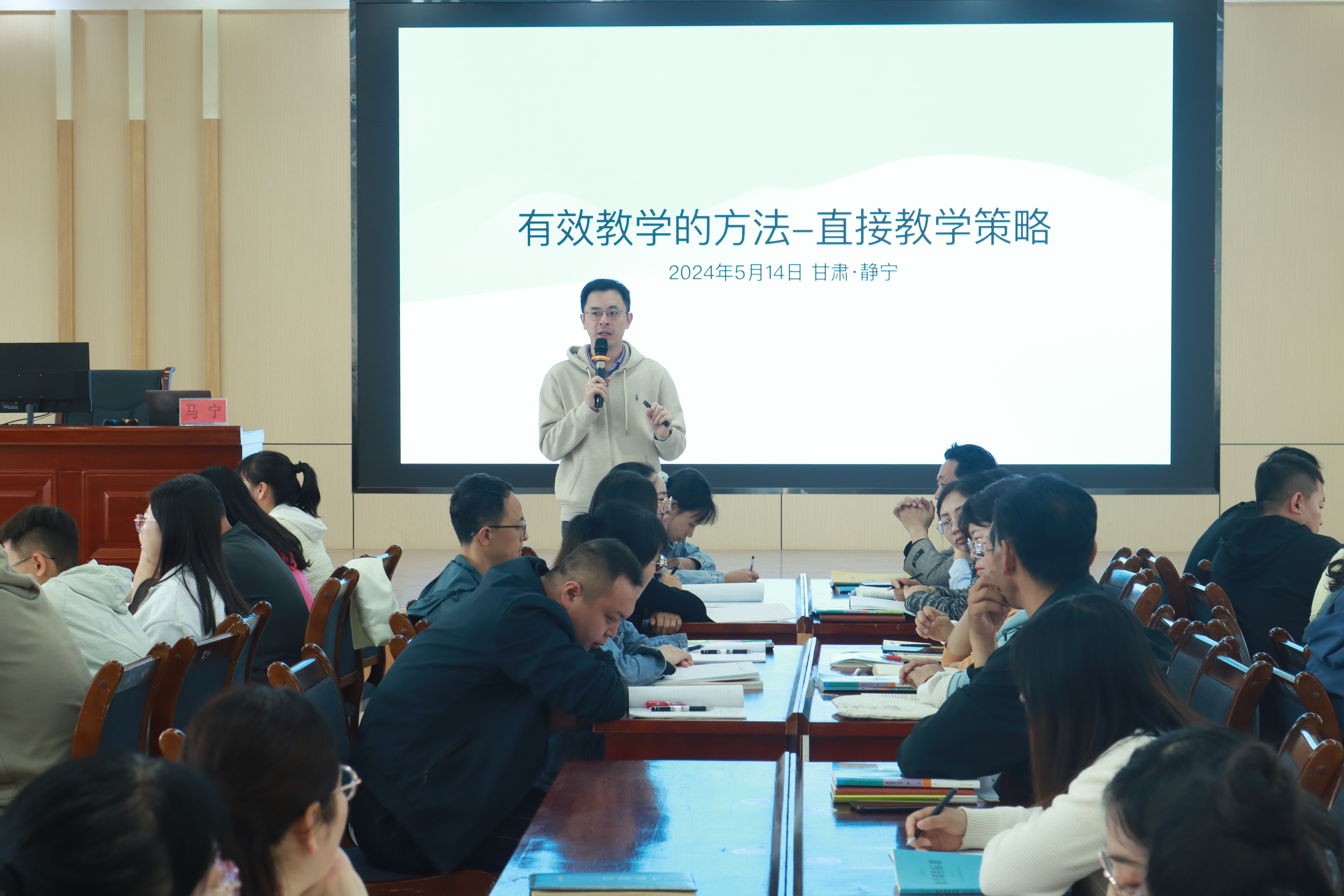 据悉,本次青年教师培训讲师马宁是“国培计划”示范性国家级骨干教师研修项目培训专家、全国初中青年数学教师优秀课一等奖获得者。培训现场,马宁从教学目标的类型、直接教学策略、直接教学实践、间接教学策略、间接教学实践等方面作了“有效教学方法”专题培训,静宁县青年教师们认真聆听,积极互动,主动设计直接教学和间接教学,内化吸收为自己的教学策略。