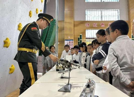 上海财经大学国旗班(武装部拓展团)学生也来到虹口区第三中心小学,和孩子们一起参观国防教育体验馆,开启了一场特别的《中华人民共和国国防教育法》学习活动。在相互交流、答疑解惑的过程中,小学生更加真切地感受到了国家的强大力量和军人的英勇风采。