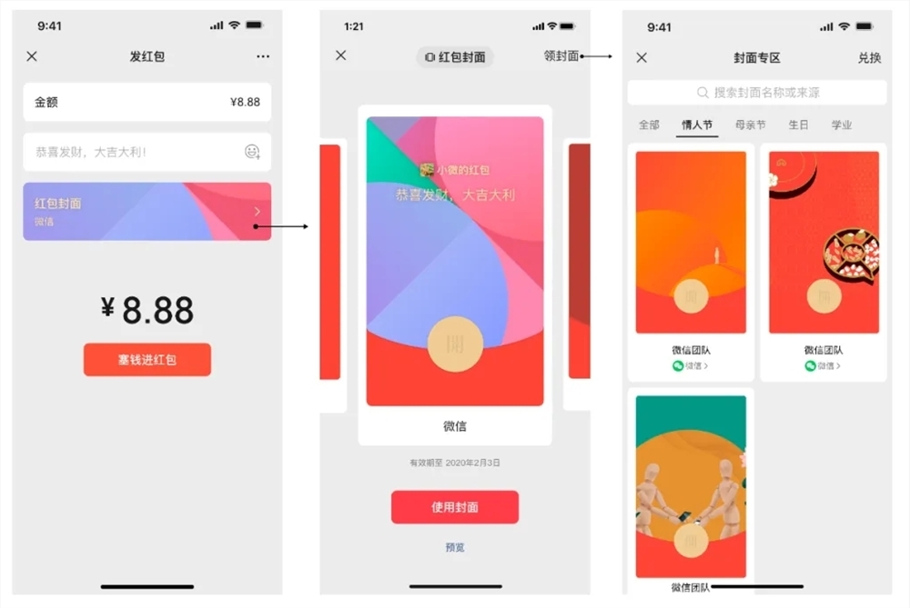「封面来源」是红包封面定制者的署名信息,定制者可按需将其配置为公众号或视频号。微信用户在「封面专区」浏览红包封面时,可前往「封面来源」了解背后的品牌信息,让定制者获得更多曝光及关注流量。