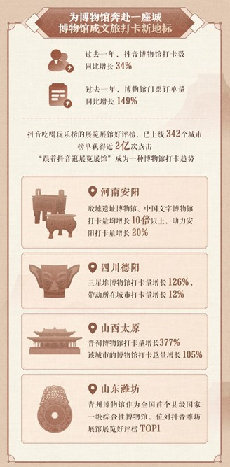 报告显示,过去一年,抖音博物馆打卡数同比增长34%,博物馆门票订单量同比增长149%。其中,河南安阳的殷墟遗址博物馆、中国文字博物馆打卡量均增长10倍以上,助力安阳城市打卡量增长20%;三星堆博物馆打卡量增长126%,带动所在城市四川德阳打卡量增长12%。