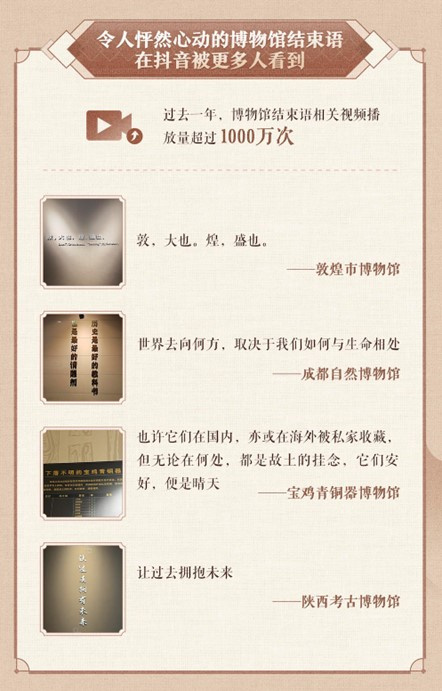 “让过去拥有未来”“敦,大也;煌,盛也。”“也许它们在国内,亦或在海外被私家收藏,但无论在何处,都是故土的挂念,它们安好,便是晴天”……这些印在博物馆展厅里的结束语,在抖音上也成为网友分享和点赞的话题。报告显示,过去一年,博物馆结束语相关视频播放量超过1000万次。