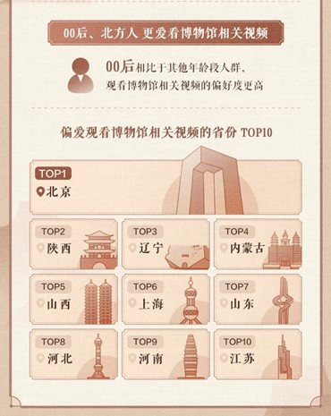从博物馆视频观众的人群年龄看,相比于其他年龄段人群,00后用户观看博物馆视频的偏好度更高。从地域看,北方人更爱看博物馆相关内容,北京、陕西、辽宁、内蒙古、山西在偏爱博物馆视频的省份中位列前五,紧随其后的是上海、山东、河北、河南、江苏。