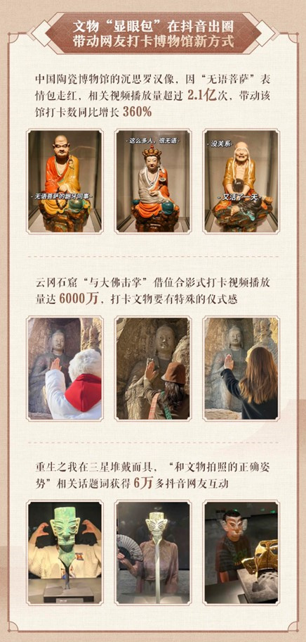 网友们打卡各地博物馆的方式也别出心裁。抖音话题词“与文物合影的正确姿势”下,网友晒出在云冈石窟的“与大佛击掌”照,在三星堆博物馆的“戴面具”借位式合影照等。中国陶瓷博物馆的沉思罗汉因“无语菩萨”表情包走红,相关话题视频播放量超过2.1亿次,带动该馆打卡数同比增长360%。
