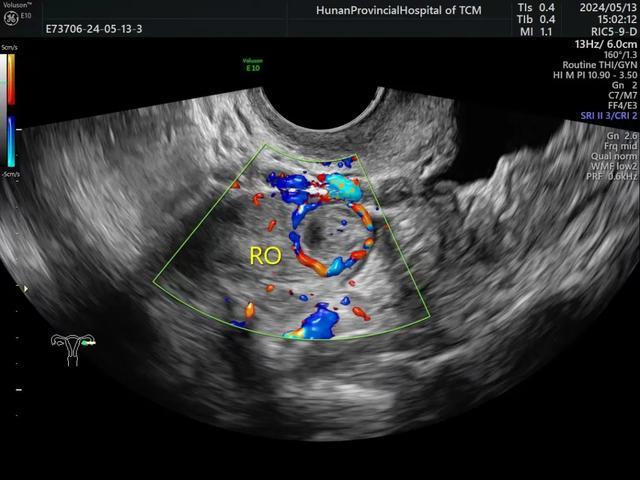 ④CDFI:部分囊肿的周边可见典型的环状或半环状血流,黄体血流一般在排卵后1-2天出现,一周左右达高峰,频谱显示为低阻血流。