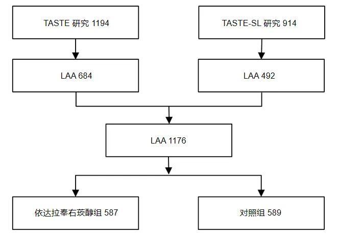 方法:该研究纳入 TASTE 和 TASTE-SL中诊断为 LAA 卒中的患者共1176例,其中587例接受依达拉奉右莰醇治疗,589例接受对照组治疗。主要终点是随机化后第90天改良 Rankin 量表(mRS)评分≤1的患者比例。次要终点为第90天 mRS 评分、第90天mRS≤2分比例和第14天 NIHSS 评分变化。安全性终点为90天内的不良事件(AE)和严重不良事件(SAE)的发生率。