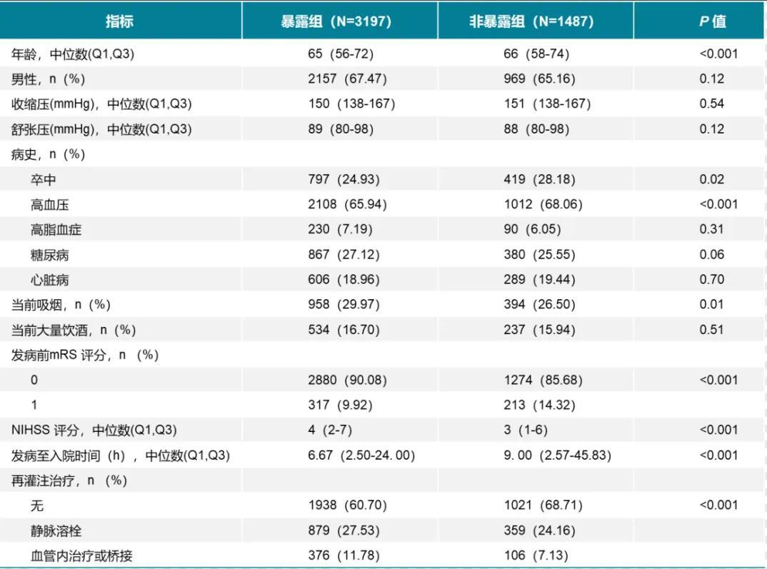 结果:两组基线特征比较发现,暴露组基线 NIHSS 评分高于非暴露组[4(2-7)vs. 3(1-6)]。暴露组的再灌注治疗率(39.30%)高于非暴露组(31.29%)。初步分析表明,在出院NIHSS 评分较基线的变化方面,暴露组[-2.26(95% CI,-2.41~-2.10)]优于非暴露组 [-1.76(95% CI,-1.99~-1.52)]。