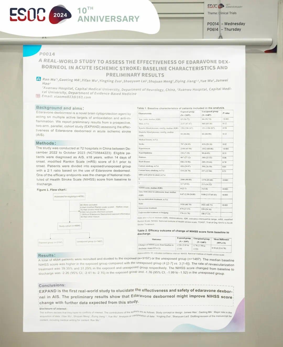 2024年3月,EXPAND研究方案全文发表在Journal of Aging and Rehabilitation(JAR)[2]。5月15日,ESOC会议首日正式公布了EXPAND的基线特征和初步结果,表明依达拉奉右莰醇在出院NIHSS较基线改善方面发挥作用[3]。全文摘要如下: