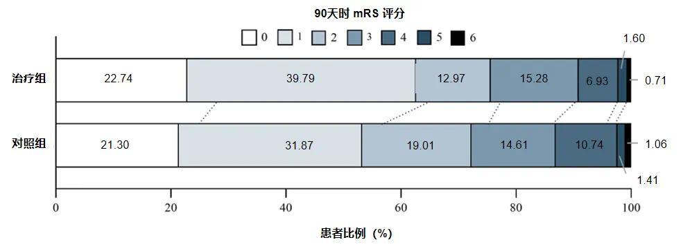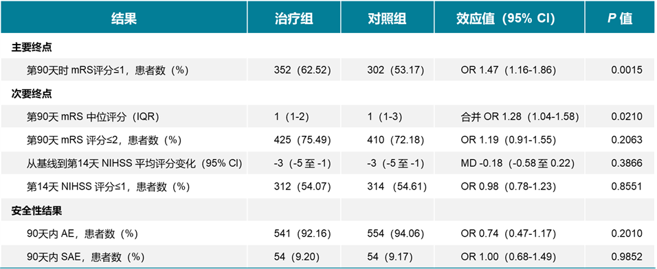结果:结果显示,两组患者基线特征差异均无统计学意义。主要终点依达拉奉右莰醇组第90天 mRS 评分≤1的患者比例显著高于对照组[62.52% vs 53.17%;OR=1.47(95% CI,1.16–1.86);P=0.0015]。次要终点显示,与对照组相比,依达拉奉右莰醇组的mRS评分明显下降 [1(1-2) vs 1(1-3); OR=1.28,95% CI,1.04-1.58);P=0.021)。安全性结果显示,依达拉奉右莰醇组与对照组的不良事件发生率相似。